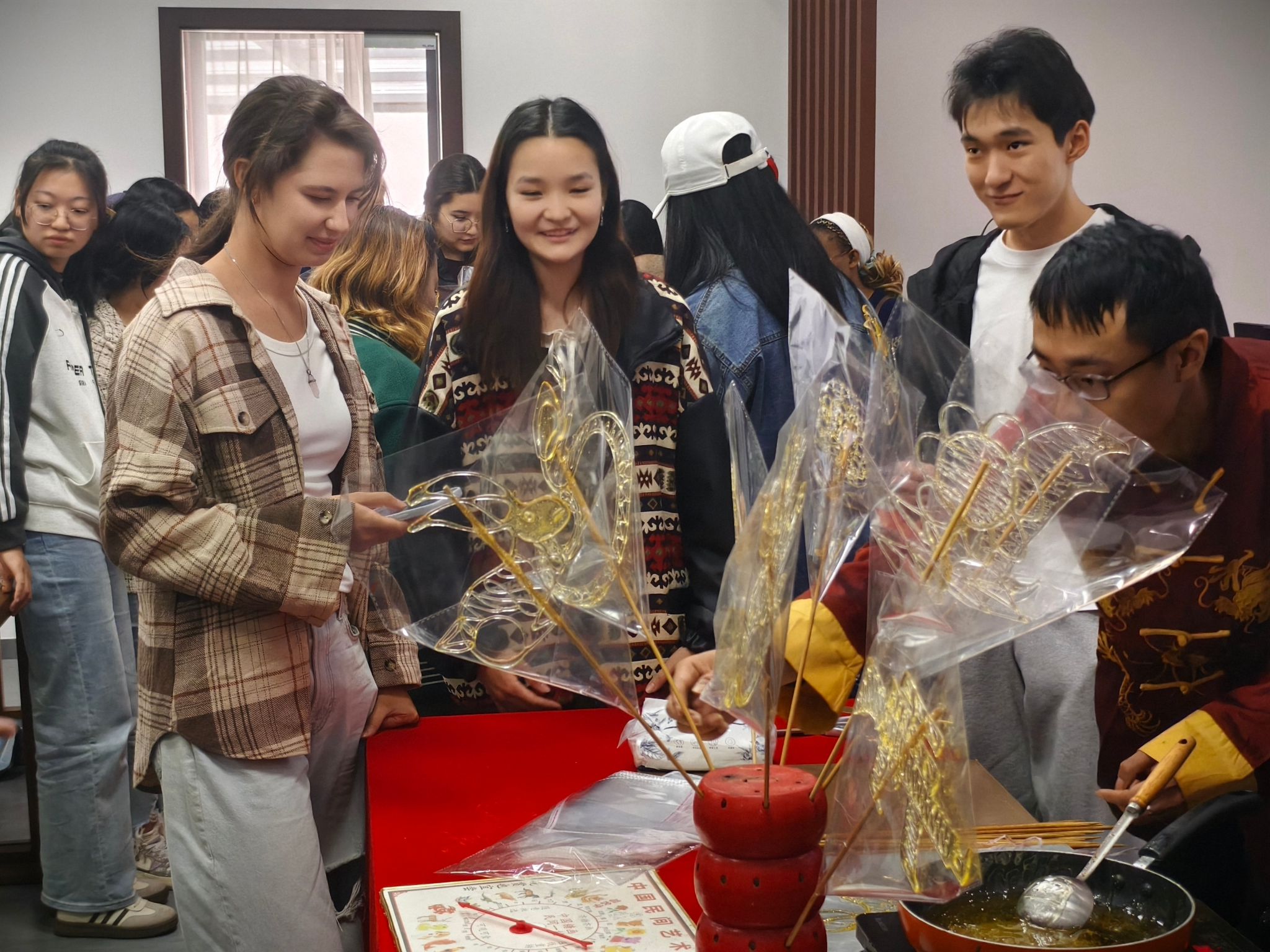非遗传承人通过"执勺如笔,运腕走丝"的技法演示,向国际员工展示了糖画制作的核心技艺,一对一指导国际员工熬糖、运勺、浇铸,在糖浆的流动中创作出生肖、花鸟等独具特色的糖画作品。